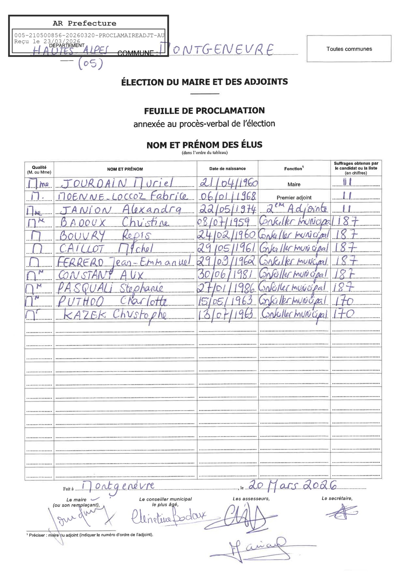 Le 20 mars a eu lieu le premier Conseil Municipal de la nouvelle mandature. À l’unanimité des nouveaux élus, Madame Muriel Jourdain a été élue Maire de la Commune de Montgenèvre. Après s’être fait remettre l’écharpe tricolore par le Maire sortant, Guy Hermitte, et par Mme Christine Badoux, elle a présidé la séance qui a vu élire M. Fabrice Moenne-Loccoz en qualité de 1er Adjoint et Mme Alexandra Janion en qualité de 2ème Adjointe. Bienvenue à toute la nouvelle équipe !
